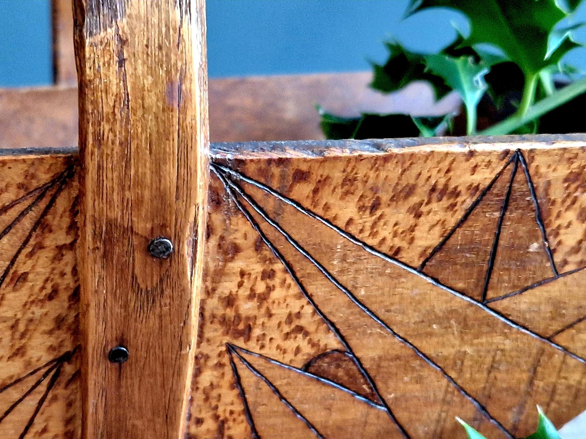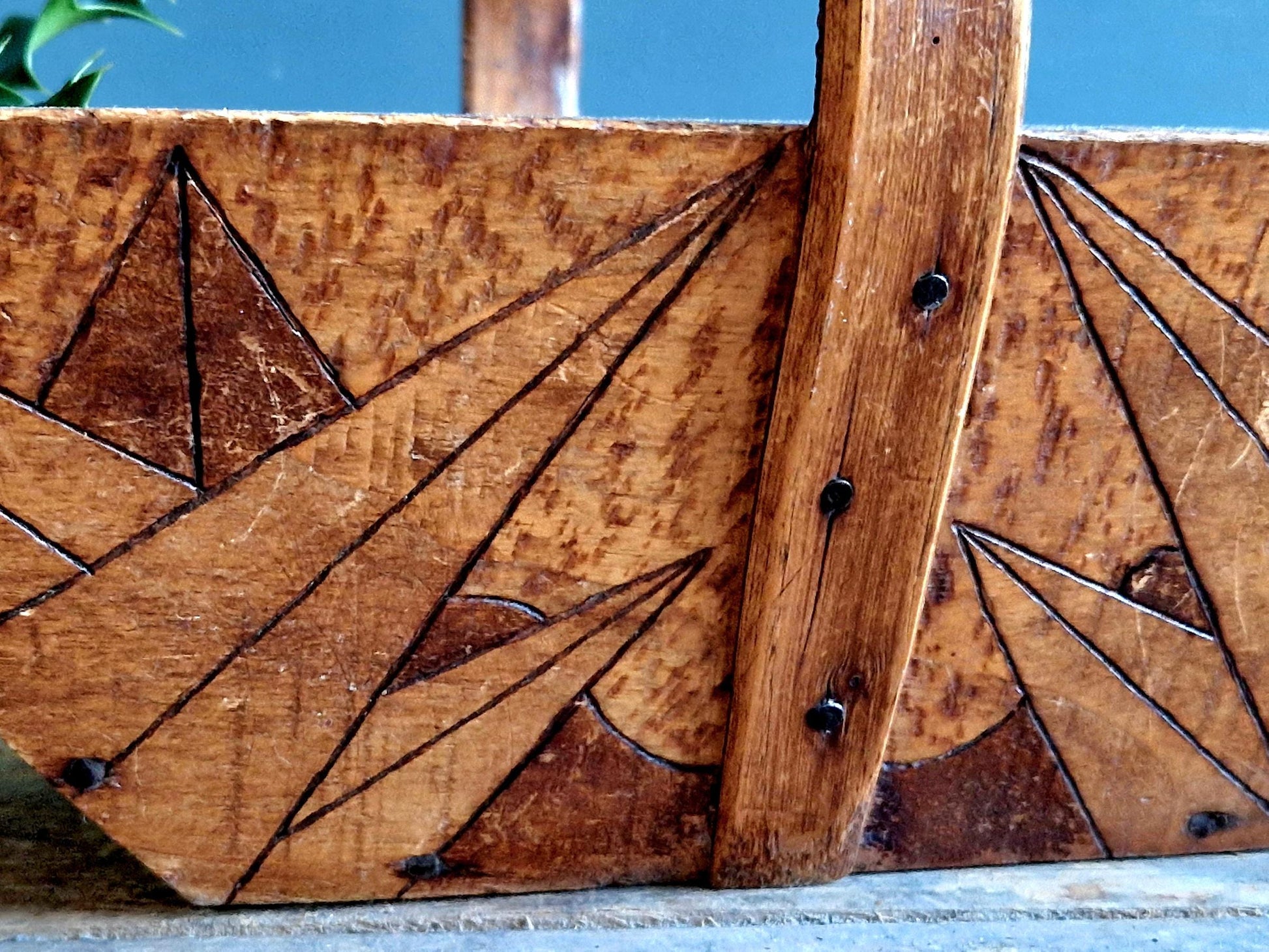 Here we have a beautiful little garden trug. It has a wooden handle above and the sides are decorated in an Art Deco styled pattern with geometric forms, which helps to date this trug to the twenties or thirties.