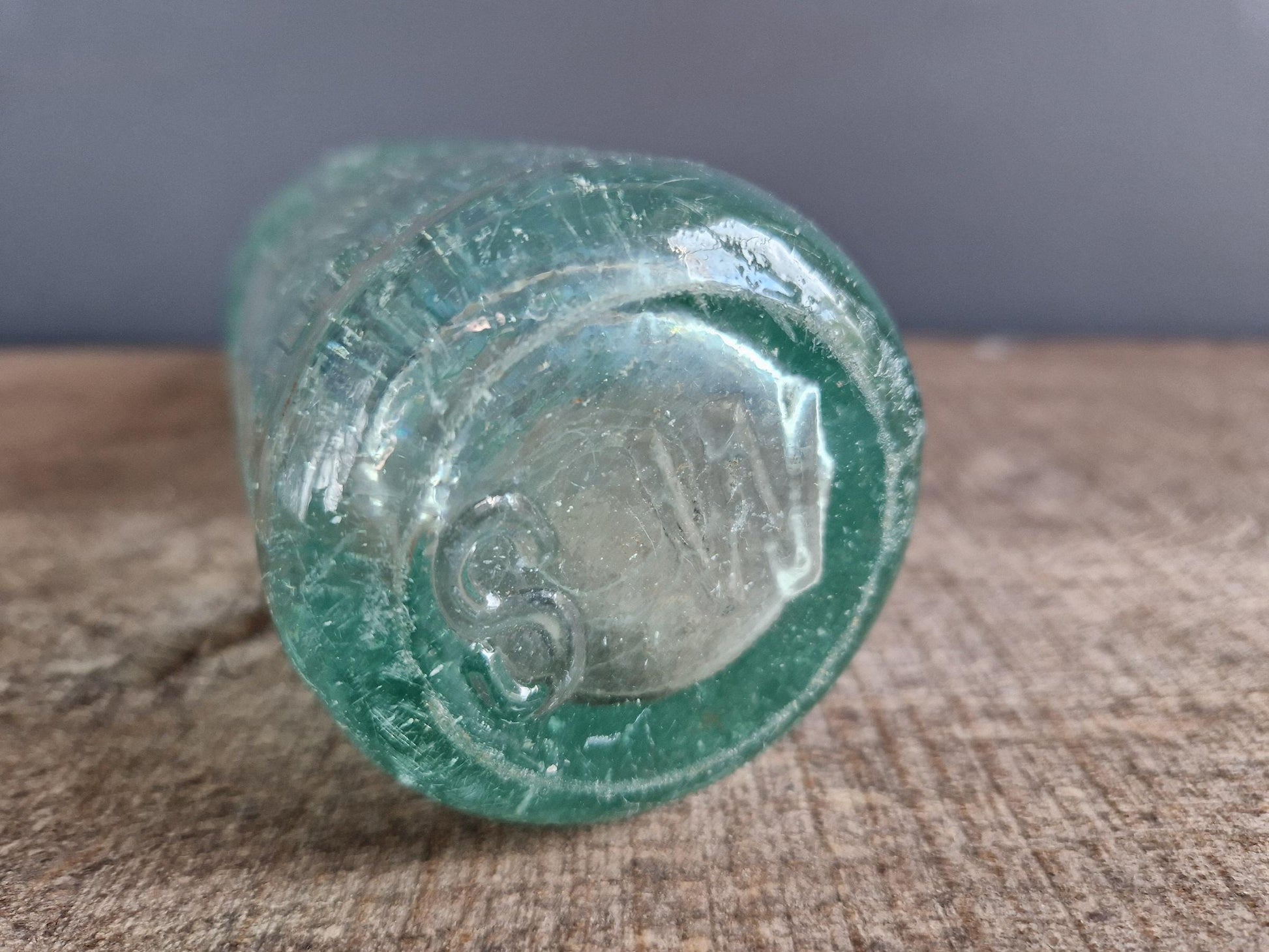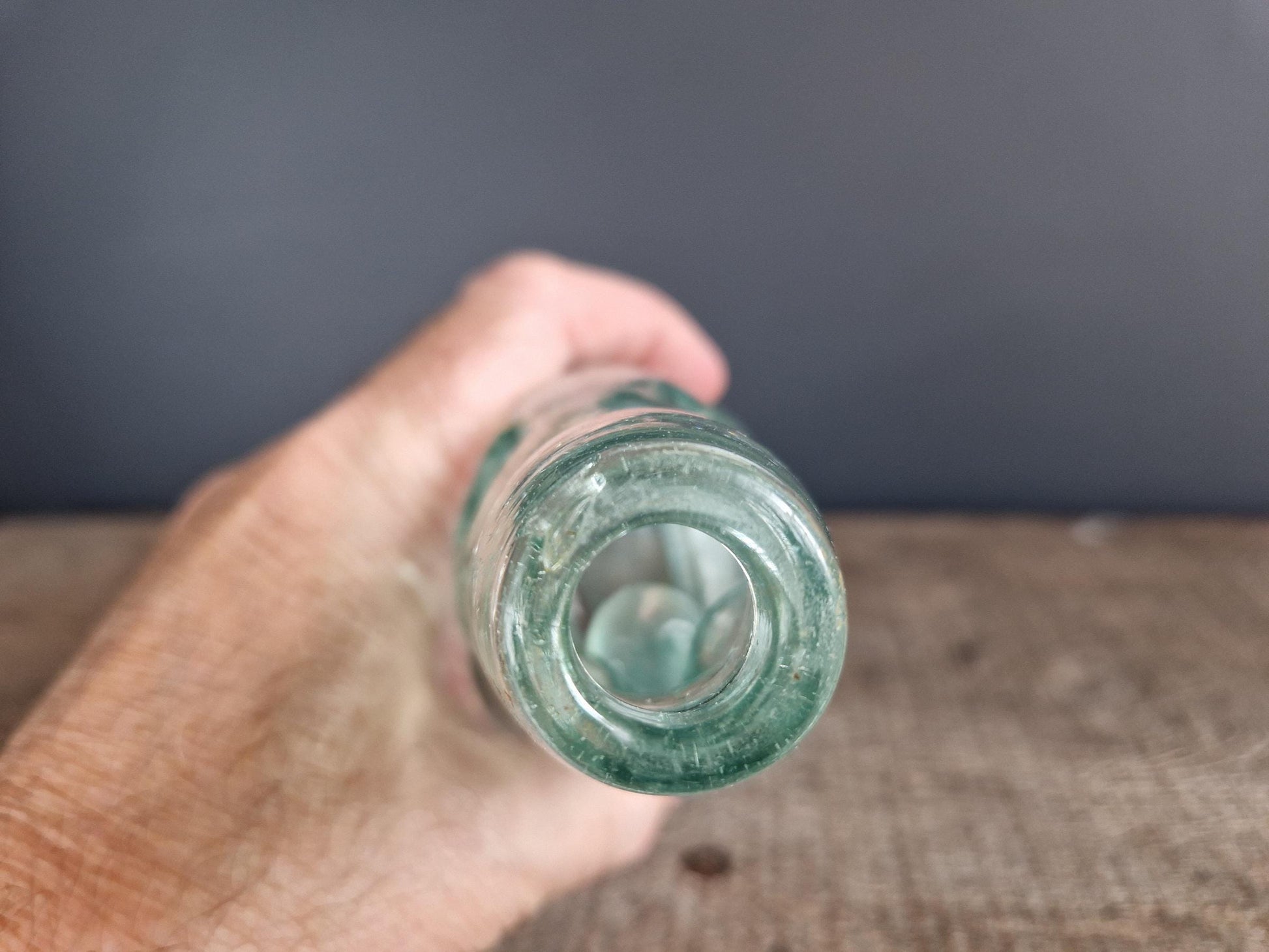 Here we have a really interesting old green bottle. It dates back to the Victorian era and comes from England. These bottles were used for carbonated drinks and this bottle still has the marble in place. It is a very clever design by a chap called Hiram Codd of Camberwell in London He designed it in 1872. The bottles were filled upside down and the marble was pressured against a rubber seal to keep the contents fizzy. The bottles are becoming quite rare. Many were smashed by children in the old days to retrieve the marbles from the neck.