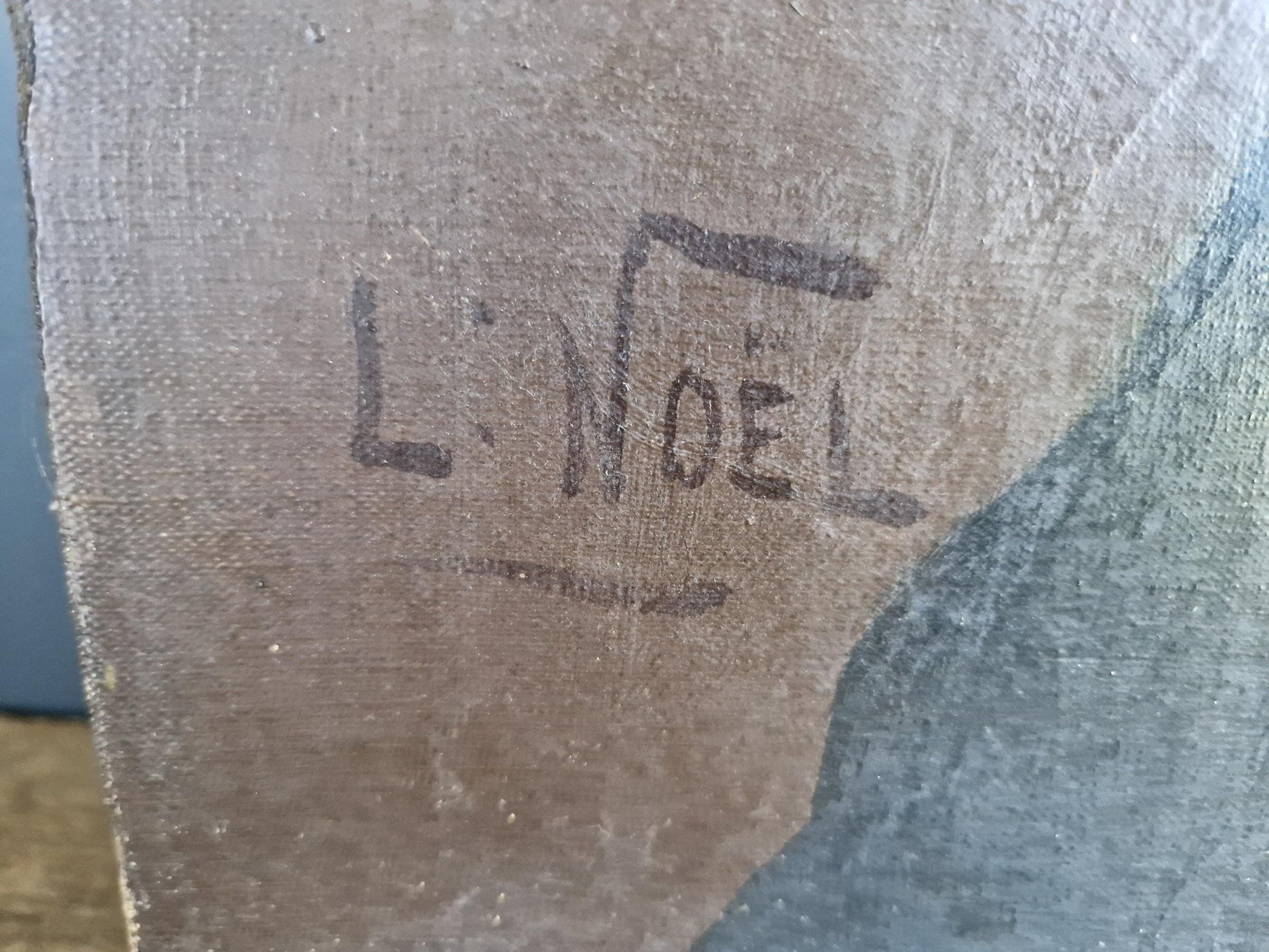 There is a signature in the bottom left had corner for L Noel. There are a few condition issues, as you can see in the photos there is some scratching to the bottom right hand corner and there is a very small dent to the left of the gentlemans face which you can see in the photos. At a certain angle you can see on the painting around the face, the crackling is formed into a circular pattern. you can see this clearly on photo four.