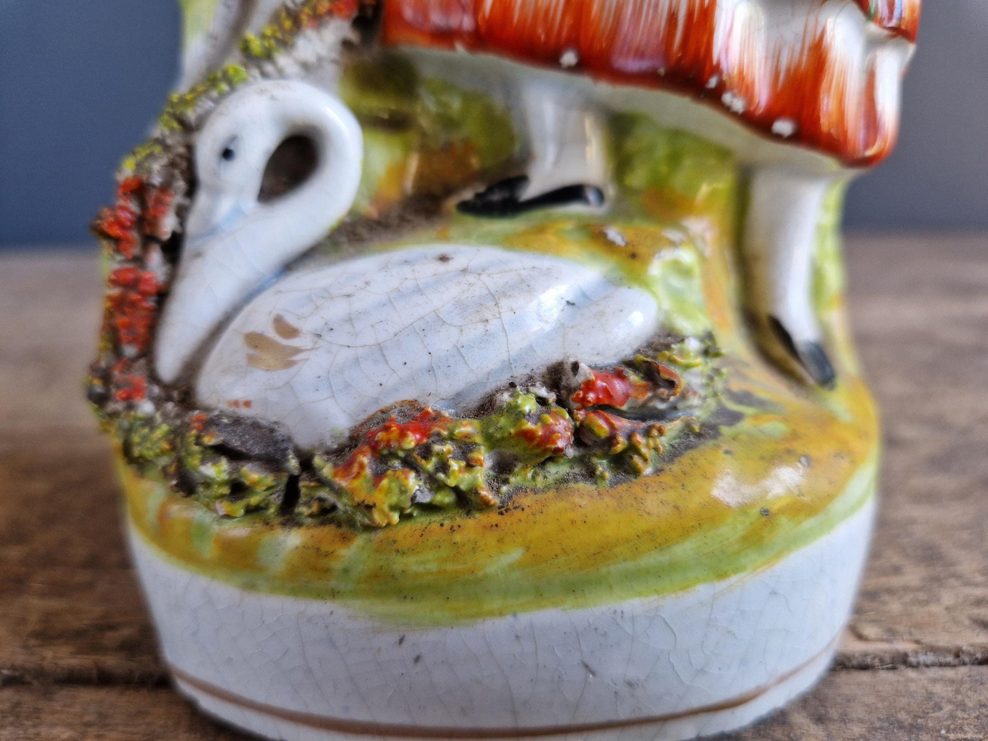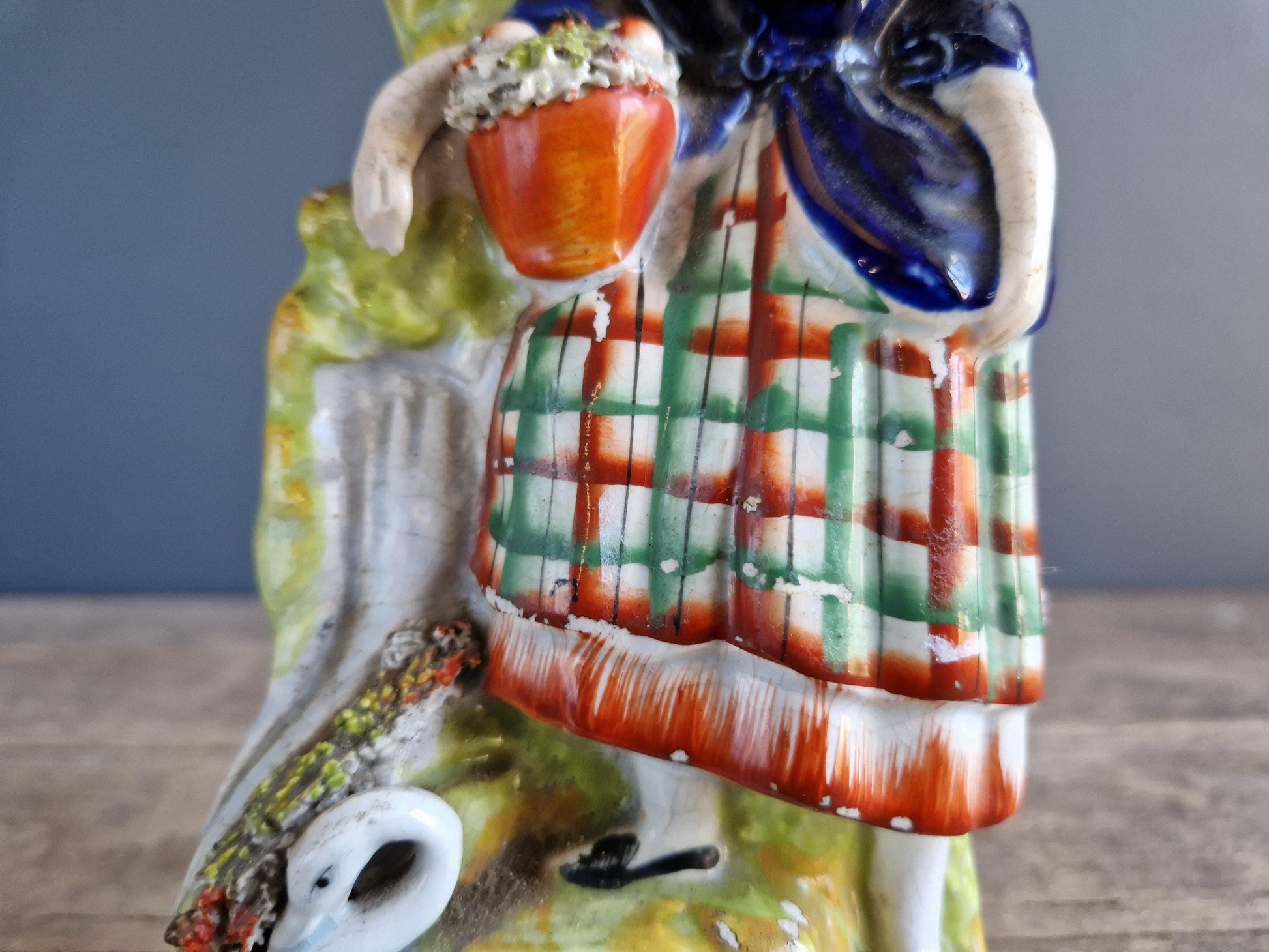 Here we have a wonderful old antique showing a girl in a tartan dress with a swan at her feet and a laden basket in her hands. It is a spill vase and has a spill holder to the side fashioned as a tree. The overall condition is good for its age, it probably dates to around the mid nineteenth century, but she does have some damage to her nose as you can see in the photos and there is a chip to the base at the back. There is also some minor paint loss and general wear here and there.