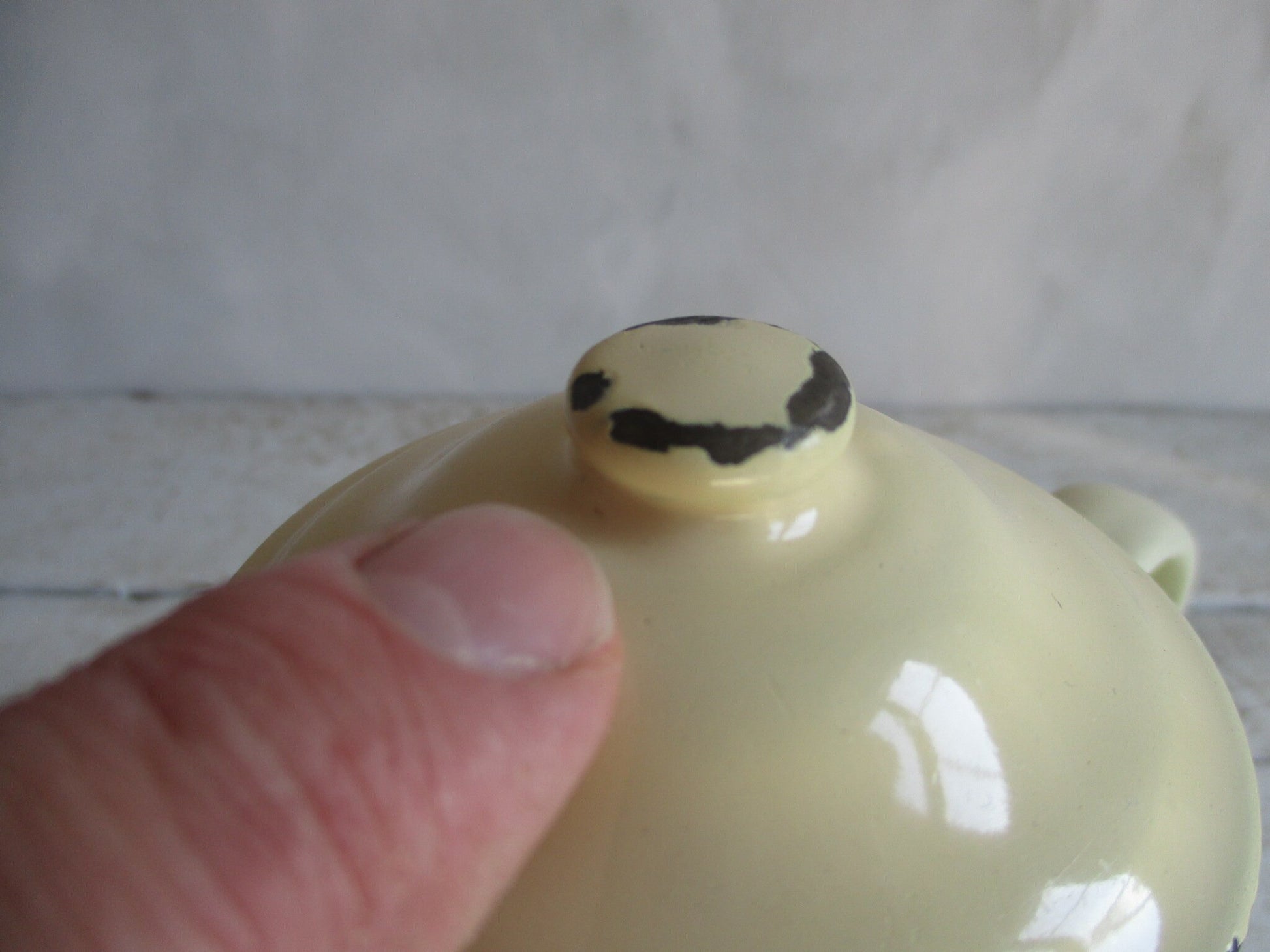 It is in a good condition overall but has some rusty chippy areas as you usually find on these original vintage pieces. It is in a creamy yellow colour and has a green rim on the base and top which really helps to lift the decorative appeal.