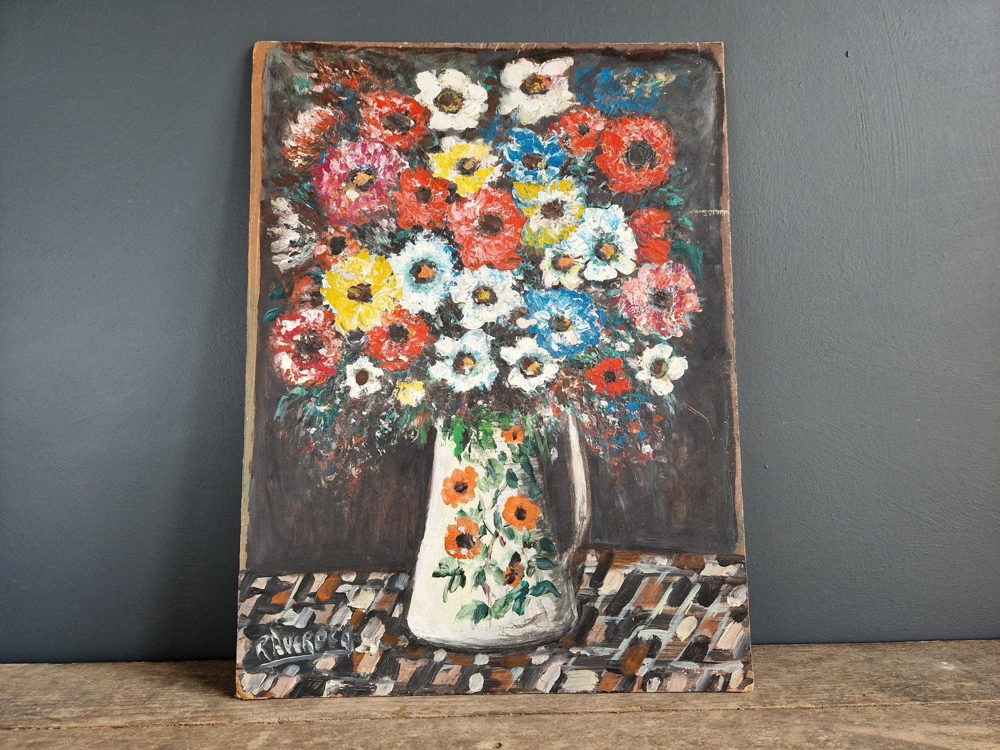 The overall condition is good, there are a few minor scratches here and there you can see one in photo number five to the right hand side. I find this painting quite charming, a real burst of colour that would liven up any wall. I really like the way the artist has painted the jug and the patterned tablecloth.