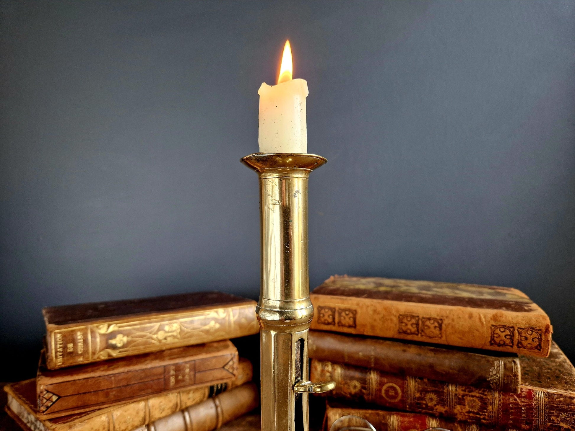 A truly delightful French brass candle holder with a sie ejector lever. A real quality antique piece. This is an early candlestick dating to either the early nineteenth century or perhaps late eighteenth.