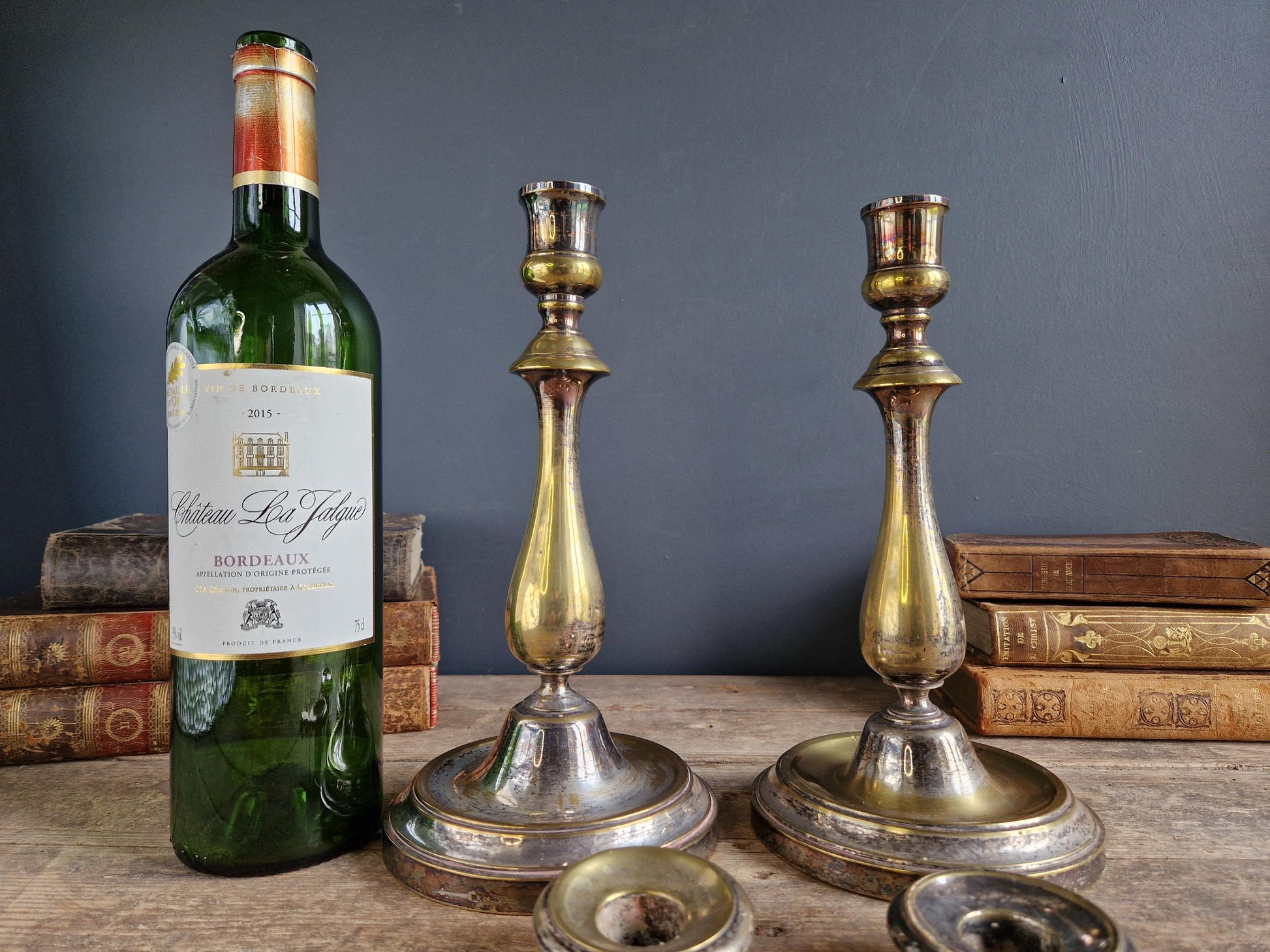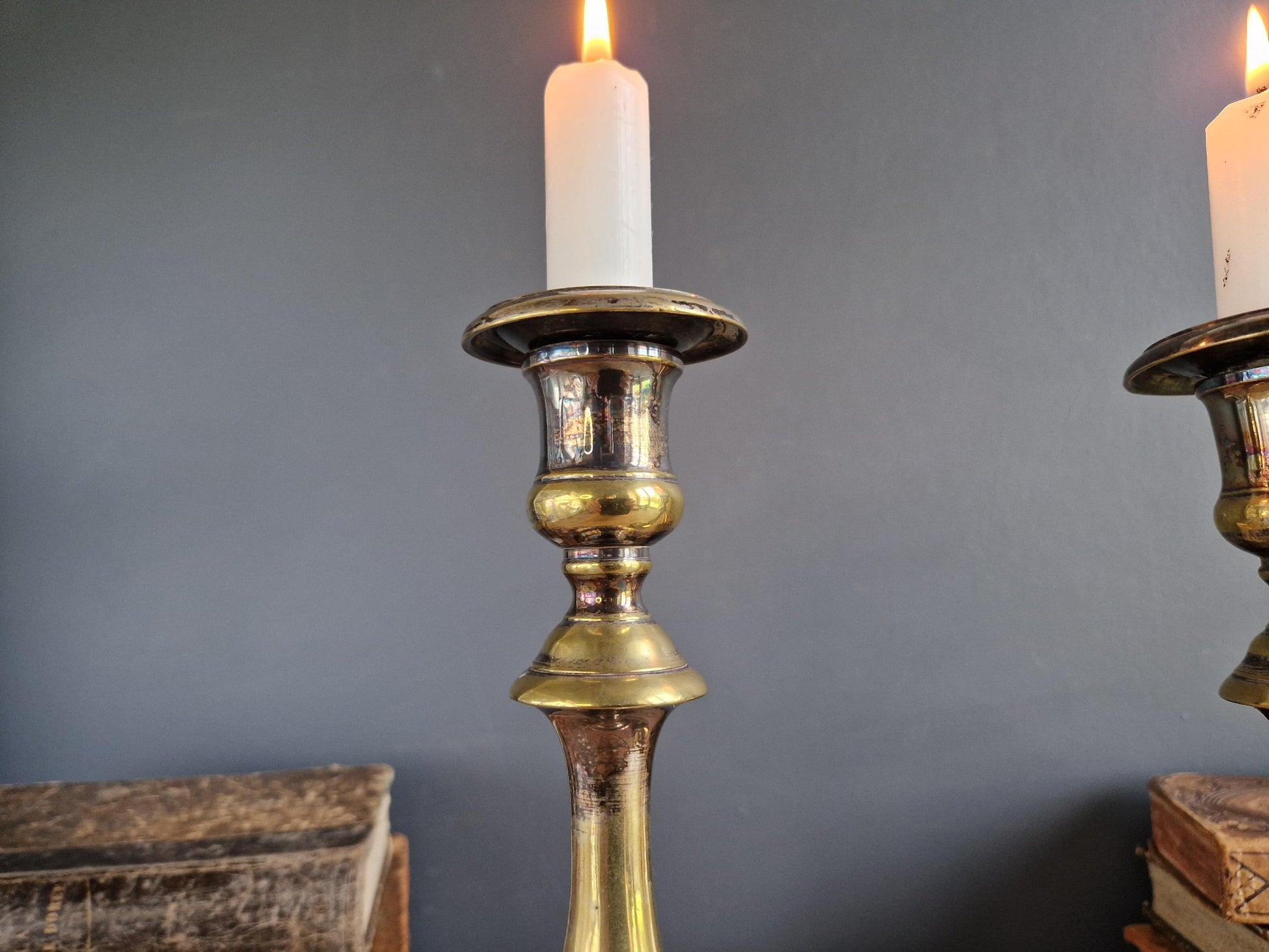 A beautiful pair of French candlesticks, If you want to create a genuine Victorian decor then these candlesticks would be perfect. They are in a simple but elegant form with baluster shaped columns, they are a really solid pair of antique candle holders. These candlesticks were originally silver plated and you can see where over the years the silver has worn away to reveal the brass beneath which gives a really pleasing two tone effect.