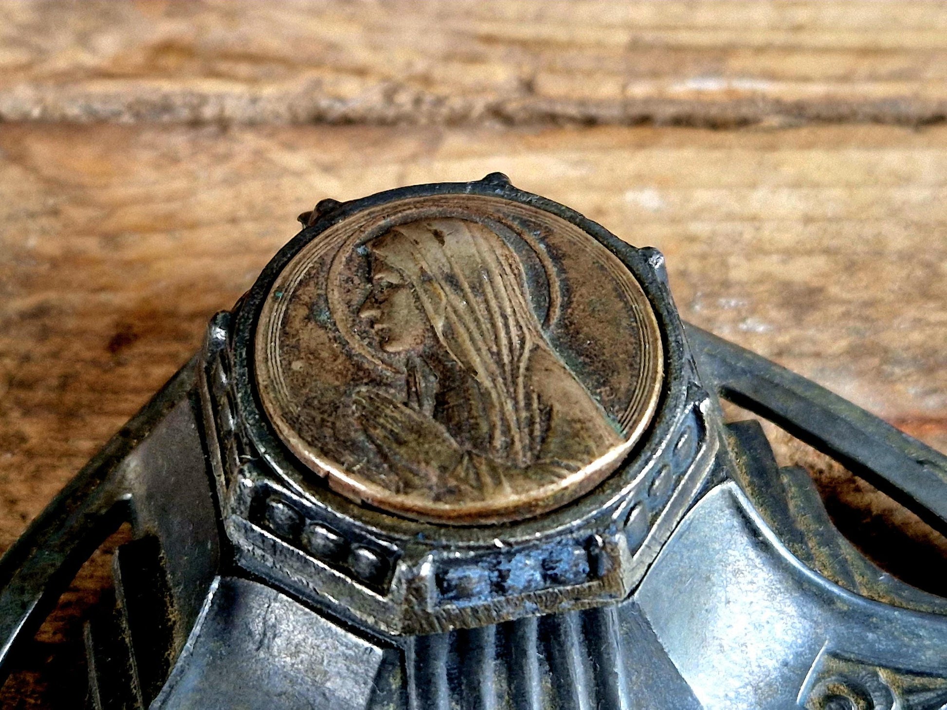 This lovely inkwell is in good condition for its age with nice patination developed over the years. This is a very small inkwell so please check the dimensions carefully. I would think this inkwell dates to the early twentieth century.