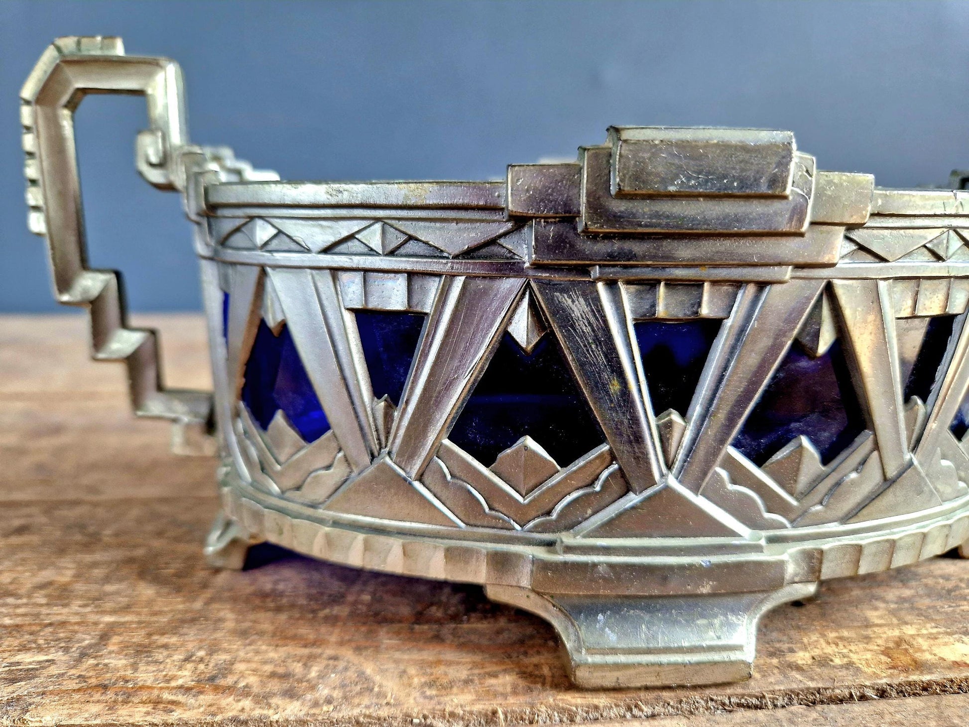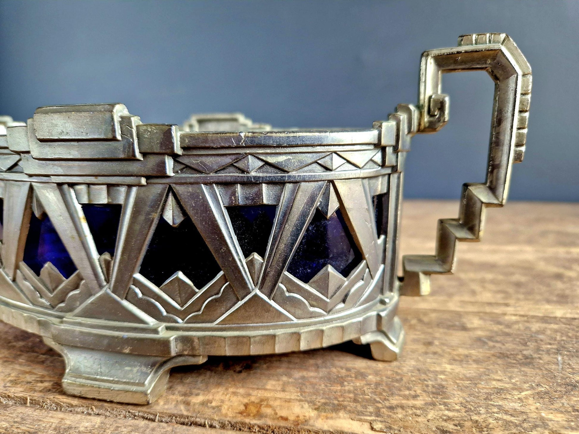 French Art Deco jardinaire. Blue glass lined jardinaire.