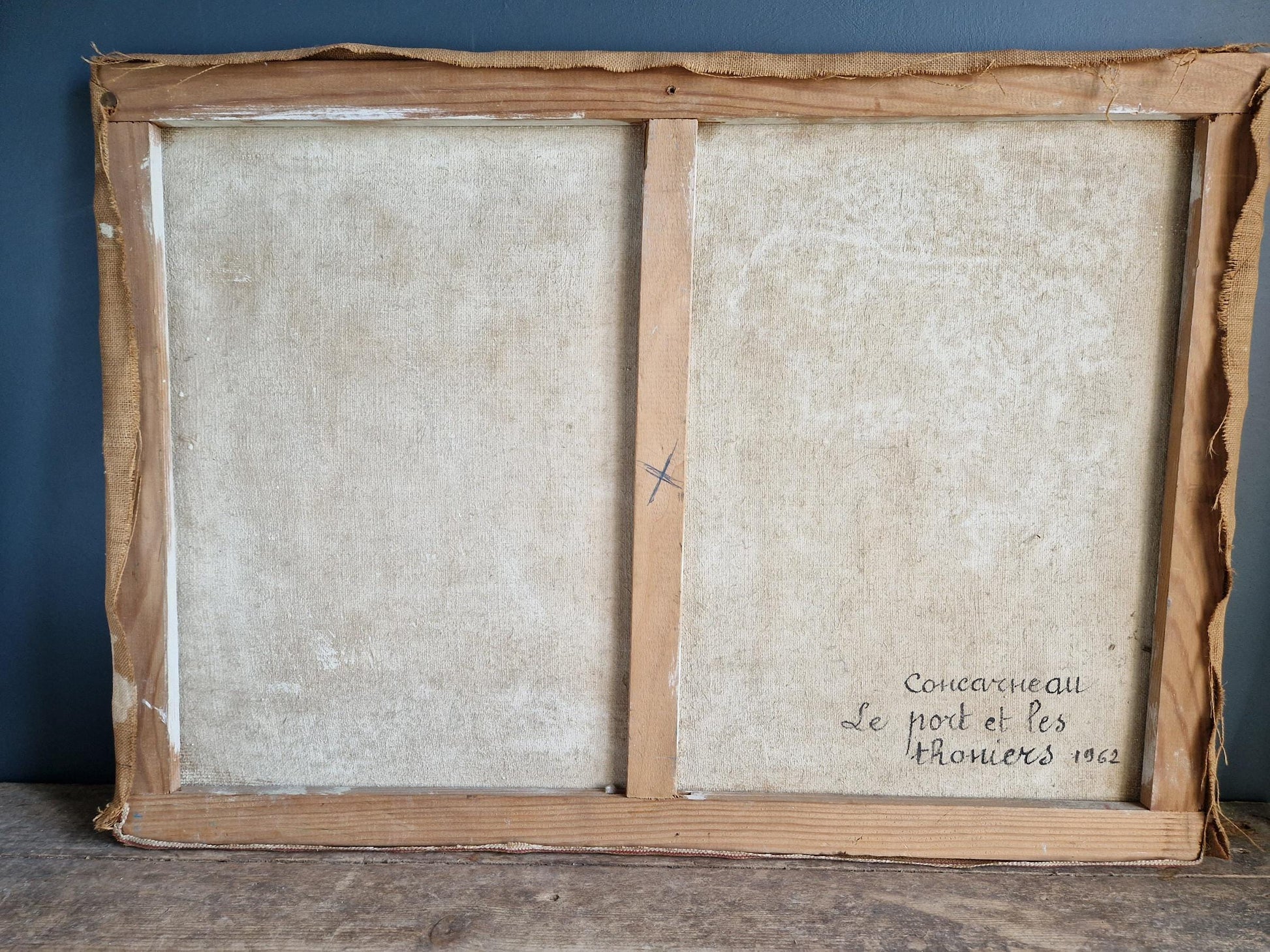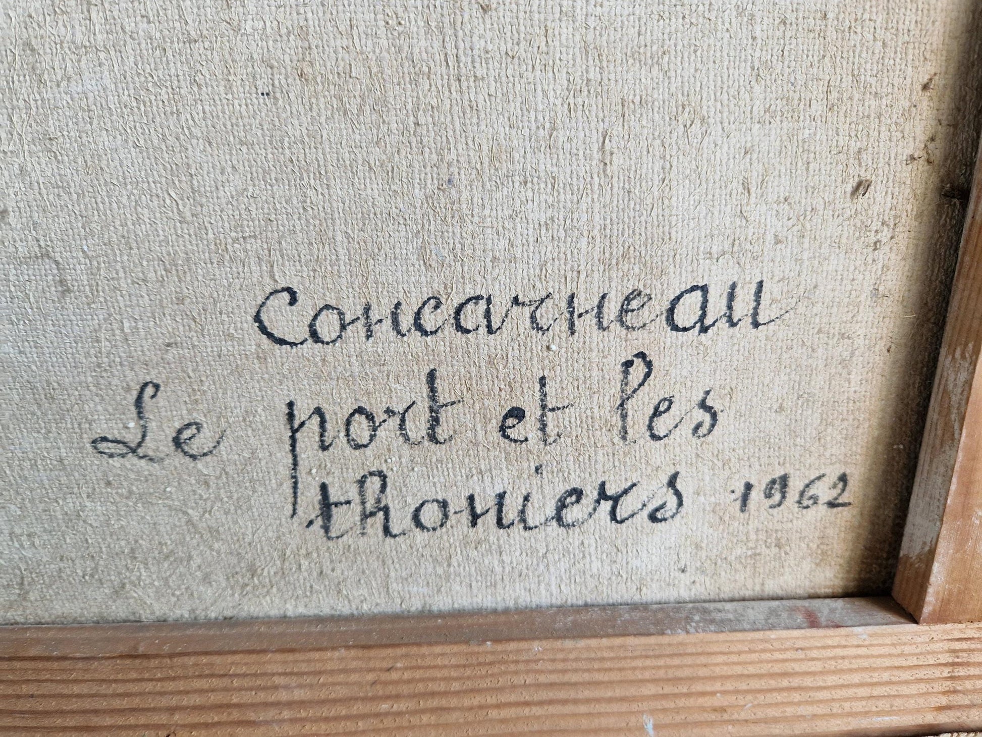 This painting has the benefit of having some information on the back. It was painted in 1962 and is showing tuna boats in the port of Concarneau which is on the west Brittany coast.