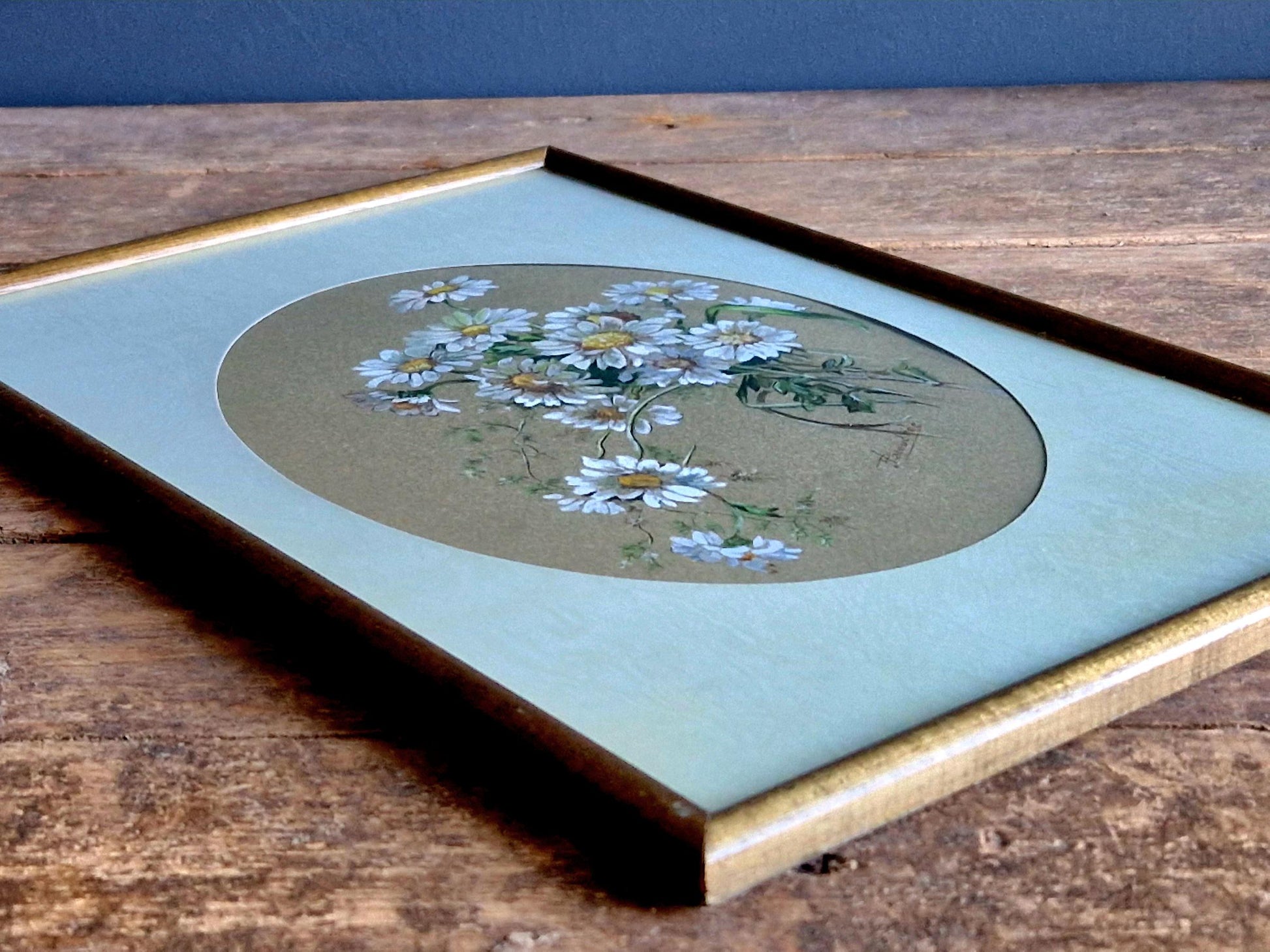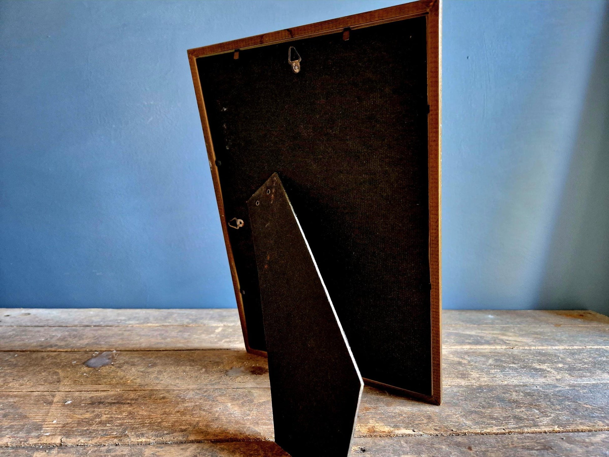 The painting is probably dated to around the mid century though the frame looks to be more modern. The frame has a small hook for hanging but it also has a pull out stand like a photo frame.