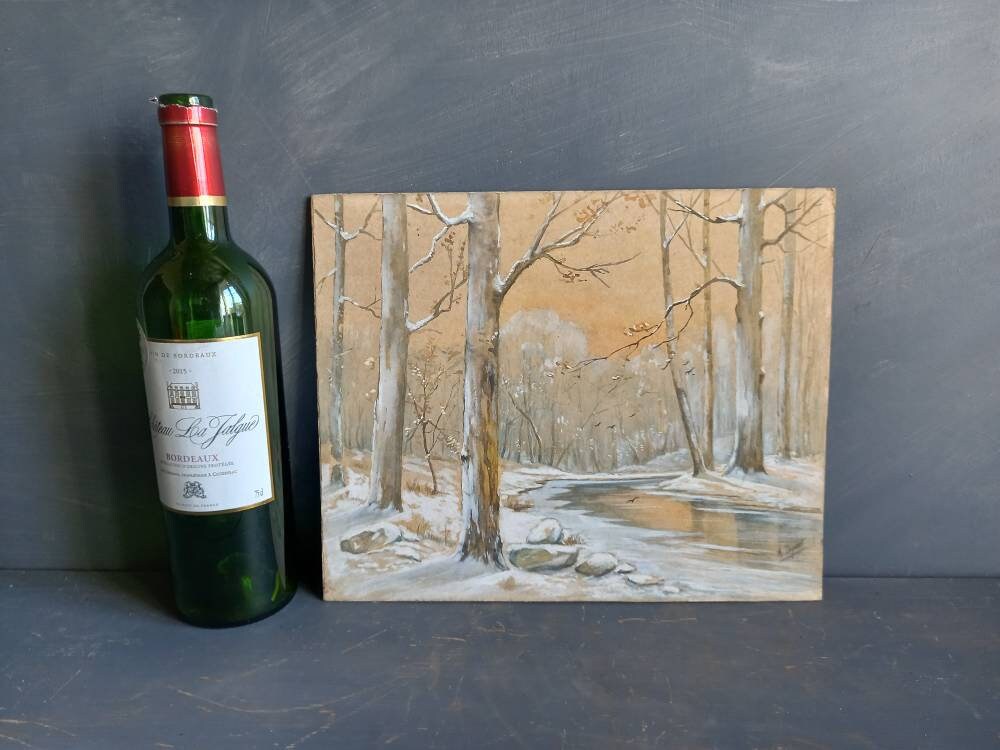 French gouache painting of snowy winter forest scene.