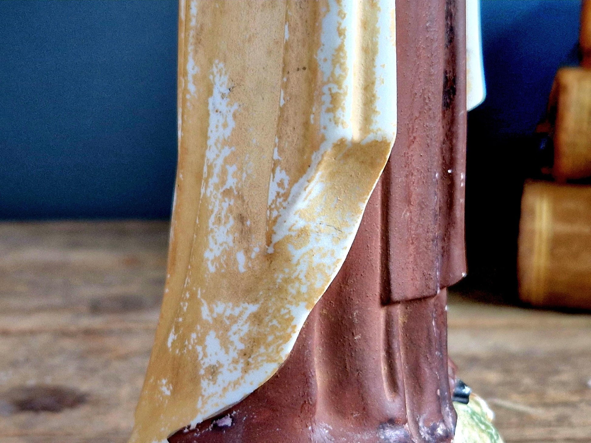 The condition overall is good, there are some surface marks which you can see in the close up photos but nothing too bad for her age. These old statues when kept in old farmhouses and cottages with open fires tend to take on some staining over the years which is to be expected.
